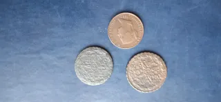 Conjunto de monedas de plata con detalles históricos.a subido la plata fe 3 a 9euros - Moneda con perfil de personaje y fecha 1908. - Dos monedas circulares con escudos y agujeros en los bordes.