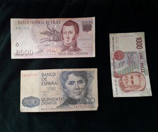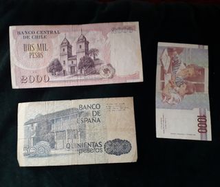 Precio por el lote. Tambien vendo por separado. Espana. Billete 500 ptas de 1979, 60 euros. Italia. Billete 1000 liras de 1990 , 10 euros. Chile. Billete de 2000 pesos de 1999, 25 euros. Entrego en mano en Salamanca, zona estación de bus o del Hospital Stma. Trinidad. Entrego en Madrid zona Mercado Chamartín/metro Colombia. También en Estación P.Pío o Chamartín Renfe. También envío por correos ordinario y pago por Bizum. Otra opción de compra con protección en el envío, pregúntame.