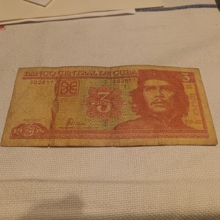 Billete de 3 pesos cubanos del Banco Central de Cuba, con fecha de año 2005. Presenta la imagen de Ernesto Guevara. - Serie: FB-02 - Número de serie: 502811 - Año de emisión: 2005 El billete esta bastante usado. Parece que ha pasado por las anos de todos los cubanos antes de llegar a las mias. Puedo entregarlo en mano en Madrid en la zona del tanatorio de la M-30.