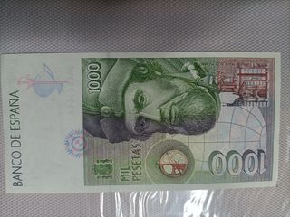Billete antiguo español de 1000 pesetas del Banco de España. Una pieza de colección. - Diseño detallado con retratos. - Borde decorativo. - Número de serie visible.