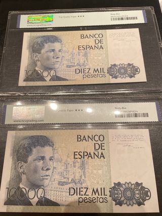 Se vende pareja de billetes de 10.000 pesetas del año 1985. Los que se ven. - Billetes España acuñados por FNMT en 1985 - Certificados por NCV España con 65/65*** en cápsula perfecta.