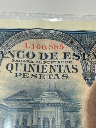 Antiguo billete del Banco de España con valor de 500 pesetas, emitido en Madrid el 24 de julio de 1927. - Serie: 1.100.585 - Denominación: Quinientas Pesetas - Fecha de emisión: 24 de Julio de 1927 - Lugar de emisión: Madrid