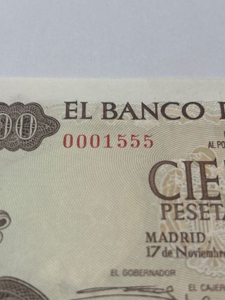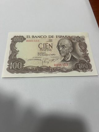Billete antiguo de 100 pesetas del Banco de España, emitido en 1970. - Serie: 0001555 - Fecha: 17 de Noviembre de 1970 - Lugar de emisión: Madrid