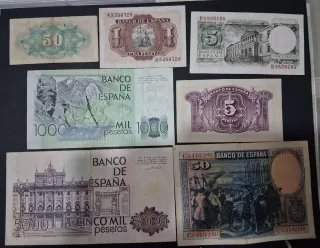 Conjunto de billetes españoles de pesetas. - Billetes de 1000 pesetas. - Billetes de 500 pesetas. - Billetes de 50 pesetas. - Billetes de 5 pesetas. - Billetes de 2 pesetas. - Billetes de 1 peseta.