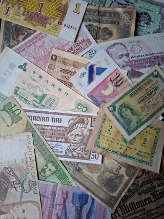 Colección variada de billetes de banco de diferentes países y denominaciones. Ideal para coleccionistas. - Billetes de 100 francos belgas. - Billetes de 100 pesetas españolas. - Billetes de 1 dólar estadounidense. - Billetes de 10 rupias de Seychelles. - Billetes de 100 rupias indias. - Billetes de 100.000 liras turcas. - Billetes de 500 rupias indonesias. - Billetes de 1000 rupias indonesias. - Billetes de 20 francos franceses. - Billetes de 100 baht tailandeses. - Billetes de 2 rand sudafricanos. - Billetes de 500 rupias de Brasil.