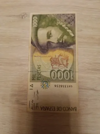 Billete antiguo español de 1000 pesetas del Banco de España. Una pieza de colección. - Diseño detallado con retratos. - Borde decorativo. - Número de serie visible.