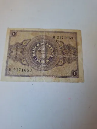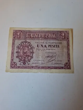 Primera peseta de Franco. Fue impresa en la Italia de Mussolini para el Bando Nacional durante la Guerra Civil Española. Muy escasa. Difícil. - Emisor: El Banco de España - Fecha: 12 de octubre de 1937 - Lugar de emisión: Burgos - Valor: Una peseta - Impreso por: COEN & C. BANCONOTE MILANO (ITALIA)