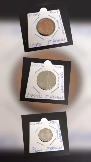 Conjunto de tres monedas de la Guerra Civil Española, pertenecientes al Consejo de Asturias y León, con fecha de 1937. II República. Lote escaso,difícil de conseguir las tres juntas.Buena conservación. -50 cents 1937 -1 peseta 1937 -2 pesetas 1937