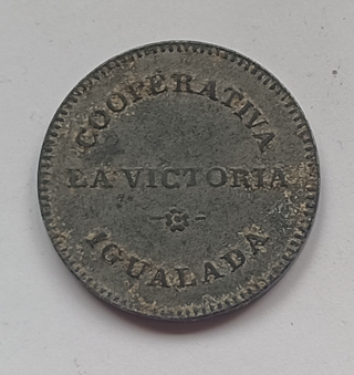 Ficha de la Cooperativa La Victoria, utilizada durante la Guerra Civil. La misma que se muestra en las fotografías. - Diseño circular con borde dentado. - Inscripción COOPERATIVA LA VICTORIA IGUALADA en el anverso. - Detalle floral central.