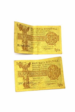 Lote de 2 billetes originales de 1 peseta, República Española, emisión 1937. Piezas históricas auténticas, con desgaste, dobleces y coloración propios de la época. Se muestran ambas caras en las fotos. Billetes fuera de circulación, valor solo para coleccionismo. Ideales para coleccionistas de billetes antiguos o Guerra Civil española.