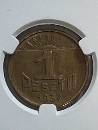 Moneda de 1 peseta de Euzkadi, año 1937. Certificada por PCGS con calificación MS64. - Grado de conservación: MS64 (Mint State 64). - País: España (Euzkadi). - Año: 1937. - Denominación: 1 Peseta. - Contexto histórico: Guerra Civil Española.