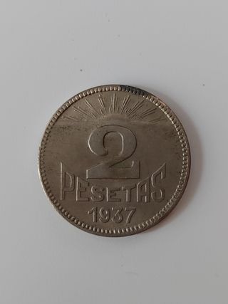 Moneda de 2 pesetas del año 1937, acuñada en Euskadi, guerra civil entrego en mano por Madrid centro envío ordinario 1€ envío certificado 6,00€ acepto transferencia bancaria, ingreso en cuenta ( banco ING) o bizum también puedo enviar por Wallapop