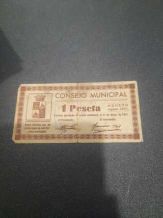 Billete local Guerra Civil 1 peseta Monzón (Huesca) 2° Emisión 21 Mayo 1937