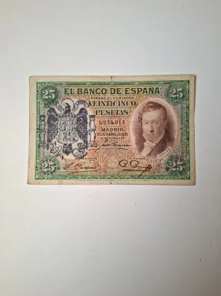 Billete de 100 pesetas del Banco de España, emitido en Septiembre de 1937 durante la Guerra Civil Española. El billete muestra un diseño con escenas de trabajo agrícola. Presenta señales de desgaste propias del tiempo, como se aprecia en las imágenes. Lema de " PAZ Y TRABAJO ".
