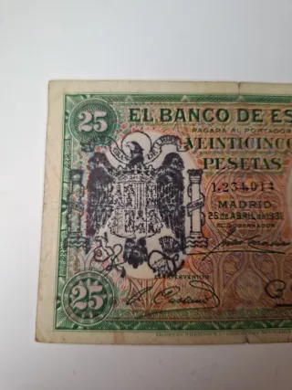 Billete de 50 pesetas del Banco de España, fechado el 25 de abril de 1931 con el sello del Aguila Negra de la Legion. Es un billete antiguo y muestra señales de desgaste por el paso del tiempo. Raro. - Billete de colección. - Fechado en 1931. - Firma del gobernador y el interventor.