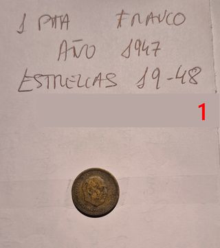 Vendo lote de monedas de 1 peseta del Caudillo Francisco Franco, usadas pero en buen estado, tal y como se muestran en las fotos. El lote se compone de: 1.- 1 moneda. 1947. Estrella *19-48. 2.- 3 monedas. 1947. Estrellas *19- . 3.- 1 moneda. 1953. Estrella *19-60. 4.- 2 monedas. 1953. Estrellas *19- . 5.- 1 moneda. 1963. Estrella *19-66. 6.- 1 moneda 50 cts. 1966. Estrella *19-71. 7.- 2 monedas Rey juan Carlos. 1975. Estrellas *19-77. 8.- 1 moneda Rey juan Carlos. 1986. Lote completo a 39 euros Hago envíos por Wallapop envíos. ENTREGA EN ALCORCÓN (ZONA C.C.LOS PINOS) O MADRID ZONA DELICIAS.