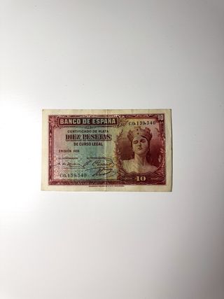 Billete de 10 pesetas del Banco de España, emitido en 1935. - Certificado de plata de curso legal. - Diseño con retrato femenino y corona. - Número de serie: A8.048.932. Escucho ofertas.