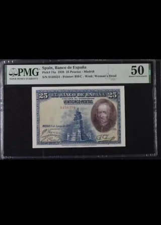 Billete de 25 pesetas del Banco de España, emitido en Madrid en 1928. Certificado por PMG. - Pick# 74a - Serie: Sin serie - Impresor: BWC - Marca de agua: Mujer con cabeza - Grado: About Uncirculated (AU)