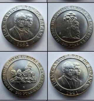 Conjunto de tres monedas españolas. - Una moneda de 200 pesetas de 1995. - Una moneda de 200 pesetas de 1992, Madrid Capital Europea de la Cultura. - Una moneda de España de 100 pesetas de 1992.