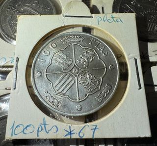 Moneda de 100 pesetas de plata del año 1966, con la marca de ceca estrella 67. - Diseño con escudos. - Canto con inscripción.