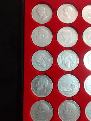 Conjunto de 17 monedas de plata de 5 pesetas.Amadeo I, Alfonso XII y Alfonso XIII. - Material: Plata. - Valor: 5 Pesetas. - Cantidad: 17 monedas.
