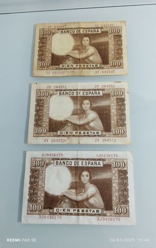 Lote de 3 billetes de 100 pts. de Julio Romero de Torres 2 billetes Madrid Abril 1953 (uno algo más deteriorado pero bien) 1 billete Madrid 7 de Abril 1953 (MUY BIEN CONSERVADO) Son los de la fotografía y merecen la pena la adquisición.