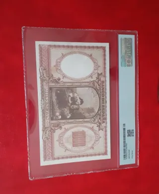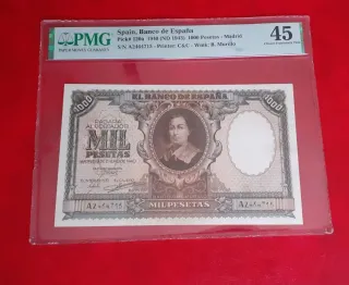Billete de 1000 pesetas de España, emitido en 1946. Certificado por PMG con una calificación de 55 (About Uncirculated). - País: España - Banco: Banco de España - Año: 1946 (ND 1948) - Denominación: 1000 Pesetas - Número de catálogo Pick: 133a - Número de Serie: 2181427 - Marca de agua: J.L. Vives - Impresor: FNMT
