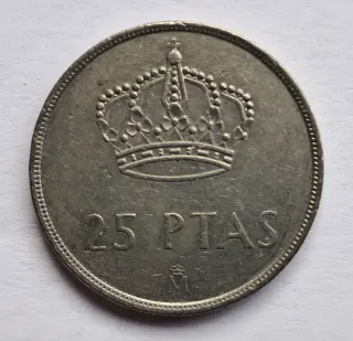 Moneda de 25 pesetas con diseño de corona. - Valor: 25 PTAS - Diseño: Corona real NUMISMATICA