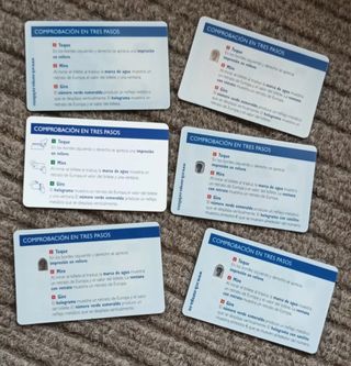 6 tarjetas emitidas por ecb.europa.eu con motivo de la retirada de la peseta e implantación del euro. Al tornalas de un lado a otro se ven las características de cada billete las cuales se nos mencionan al dorso. Son tipo tarjeta de crédito. La del billete de 500 no la hicieron.