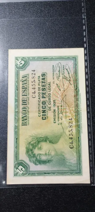 No acepto ofertas ni cambio envío por privado y correo certificado gracias Billete de 5 pesetas del Banco de España, emitido en 1935. - Certificado de plata. - Serie C. - C7.098.822 - Impreso por Bradbury, Wilkinson & Co. Ltd. Inglaterra.