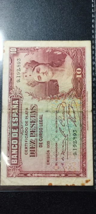 💴 Billete original de 10 pesetas 🇪🇸 Banco de España 📅 Emisión 1935 – Certificado de plata 🕰️ Pieza antigua para coleccionismo y numismática 📜 Estado muy circulado, con pliegues, desgaste y manchas visibles 🔢 Número de serie visible 📸 Fotos reales, se vende exactamente el billete de las imágenes 📦 Envío bien protegido