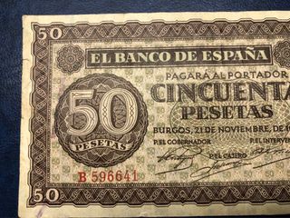 Billete de 50 pesetas del Banco de España, emitido en Burgos el 21 de noviembre de 1936. - Serie B, número de serie B596641. - Diseño con el número 50 en grande y el texto Cincuenta Pesetas. - Firma del Gobernador y del Interventor.