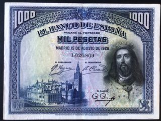 Billete de 1000 pesetas del Banco de España, emitido en Madrid el 15 de agosto de 1928. - Número de serie: 1.026.809 - Grabado por Bradbury Wilkinson & Co. New Malden, Surrey, Inglaterra.