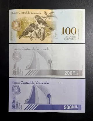 Conjunto de tres billetes de Venezuela en perfecto estado. - Un billete de 100 Mil Bolívares. - Un billete de 200 Mil Bolívares. - Un billete de 500 Mil Bolívares. Más billetes en mi perfil. No hago envíos para pedidos inferiores a 5€. Palabras clave: monedas, billetes, españoles, España, mundial, mundiales, extranjeros, antiguo, Numismatica, notafilia, lote, set, plancha, circular, banconote, monete, moedas, bilhetes, banknotes, coins, notas, contas, pesetas