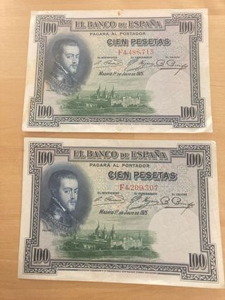 Conjunto de dos billetes de 100 pesetas del Banco de España, con fecha de Madrid del 1 de julio de 1925. Cada billete muestra el retrato de Felipe II. - Serie F4488713 - Serie F4209307