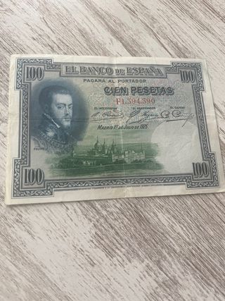 Billete de 100 pesetas del Banco de España, emitido en Madrid el 1 de julio de 1925. Presenta un retrato de Felipe II. - Valor: Cien Pesetas. - Fecha de emisión: 1 de julio de 1925. - Lugar de emisión: Madrid. - Ilustración: Retrato de Felipe II y vista del Palacio Real.