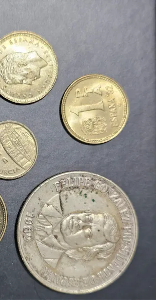 Conjunto de monedas de colección de España. - Moneda de Juan Carlos I, 1975. - Moneda de 1 Peseta, 1982. - Moneda de Felipe González, Presidente de España, 1982. - Moneda con inscripción 'Murcia'. Se vende todo junto