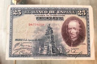 Billete antiguo de 25 pesetas del Banco de España, emitido en Madrid el 15 de agosto de 1928. Presenta un retrato de Calderón de la Barca. - Denominación: Veinticinco Pesetas. - Fecha de emisión: 15 de Agosto de 1928. - Lugar de emisión: Madrid. - Grabado por Bradbury, Wilkinson & Co. Ltd. Londres. - Número de serie: D4,729,228.