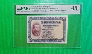 Billete de 25 pesetas del Banco de España, emitido en 1926. Certificado por PMG con una calificación de 45 (Choice Extremely Fine).Pv 250€. - Pick# 71a.Closed Pinholes - ATT WASP - SOLO EN MANO O PAYPAL - ENVIO CARTA CERTIFICADA O PREMIUM - CUALQUIER DUDA CONTACTAR