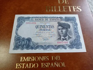 Billete de 500 pesetas del Banco de España con fecha de 23 de julio de 1971. - Serie: Emisiones del Estado Español 1936-1974. - Número de serie: 0005400. Numero bajo - Denominación: Quinientas Pesetas.