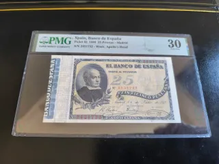 Billete de 25 pesetas del Banco de España, emitido en 1893. Certificado por PMG con una calificación de 30 (Very Fine). - Serie: Pick# 42 - Año: 1893 - Denominación: 25 Pesetas - Lugar de emisión: Madrid - Marca de agua: Cabeza de Apolo - Número de serie: 2431732 - Calificación PMG: 30 (Very Fine)