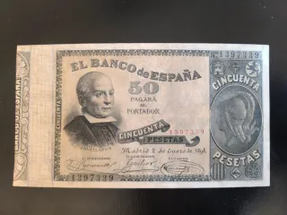 Billete de 50 pesetas de 1927. Circulado y con marcadas dobleces central y transversal. Se aprecia ligera rotura en la zona superior de la doblez central. Con manchas debido a su uso pero perfectamente distinguible. Billete con sello, ideal para completar tu colección. Si necesitas más fotos no dudes en pedirmelas