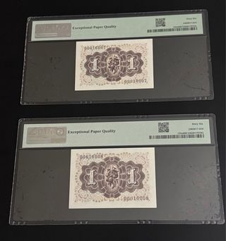 Pareja correlativa 1 Peseta de España, Banco de España, año 1948. Ambos con número de serie bajo y en estado Gem Uncirculated. - Pick# 135a - Impresos por FNMT - Grado PMG: 66 EPQ