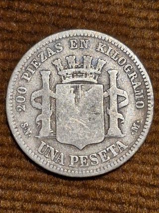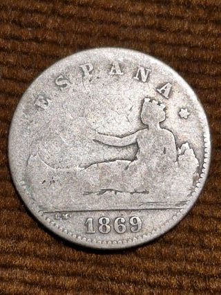 Moneda de plata de 1 peseta del Gobierno Provisional del año 1869, ceca SN-M, acuñada en Madrid. Esta pieza se distingue de la más común en que no tiene estrellas entre la fecha y la estrella está ubicada al final de la leyenda España. Rara y muy escasa. Se hicieron únicamente 367.146 piezas. Peso: 4,64 gramos. Entrega en mano en Alcorcón o envío a través de wallapop.