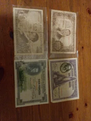 Conjunto de cuatro billetes de 100 pesetas del Banco de España. - Billetes de colección. - Cada billete tiene un número de serie único. - Diseños variados.
