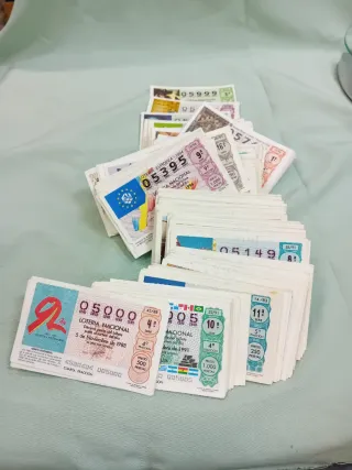 Lote de billetes viejos de Lotería Nacional española. Correlativos del 05000 al 05999 incompletos. Años variados 1984, 1988, 1992, 1996. - Peso total: 473 g.