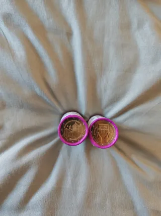 Se venden dos rollos de monedas de 2 euros de España con fecha de 2026. - Año: 2026 - Diseño 1: Poblet - Diseño 2: Manos sosteniendo escudo España democracia - Cada rollo contiene 25 monedas - Posibilidad de vender rollos y monedas sueltas - Se hacen envíos