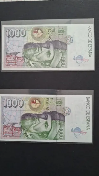 Conjunto de dos billetes de 1000 pesetas de España, emitidos en 1992. Cada billete presenta el retrato de un personaje histórico. - Banco de España. - Serie 6610976 y 6610977. - Mil pesetas. Número de serie correlativo Billetes plancha