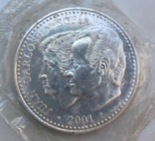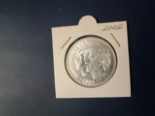 Moneda conmemorativa de España del año 2002. - Diseño de los Reyes Juan Carlos I y Sofía. - Canto con inscripción. - Presentada en protector.