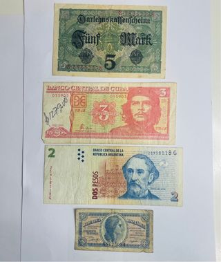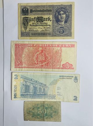 Conjunto de billetes de diferentes países. - Alemania: 5 Reichsmark. - Cuba: 3 Pesos. - Argentina: 2 Pesos. - España: 50 Céntimos.